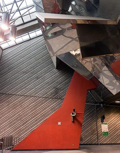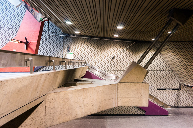 Œuvre structurale en soi, elle est composée de volumes contrastés par leurs couleurs vives et leurs formes angulaires, juxtaposés aux murs de béton brut striés de lignes diagonales. Ces lignes, rejetant les parallèles et les perpendiculaires, feraient échos aux toits des usines qui occupaient autrefois le site, rappelant l’ancien terrain vague industriel. La faible profondeur des voies permet également à la lumière du jour de s’infiltrer jusqu’aux quais par l’intermédiaire d’un puits de lumière.