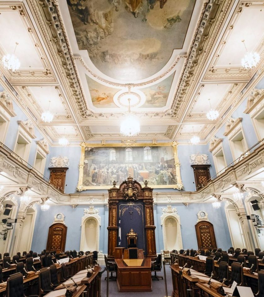 Surnommée « le salon bleu », cette salle est située au cœur de l’Hôtel du Parlement, à deux pas du Vieux-Québec et de la porte Saint-Louis. Cet édifice fut construit en 1877-1886 par l’architecte Eugène-Étienne Taché. De par sa vocation (lieu de rassemblement des parlementaires), de nombreuses décisions et débats y furent menés quant à l’identité politique et sociale du Québec. Composée d’un décor architectural d’une grande richesse, cette salle fait partie d’un ensemble d’intérieurs de grande valeur reflétant l’histoire de ce prestigieux bâtiment.