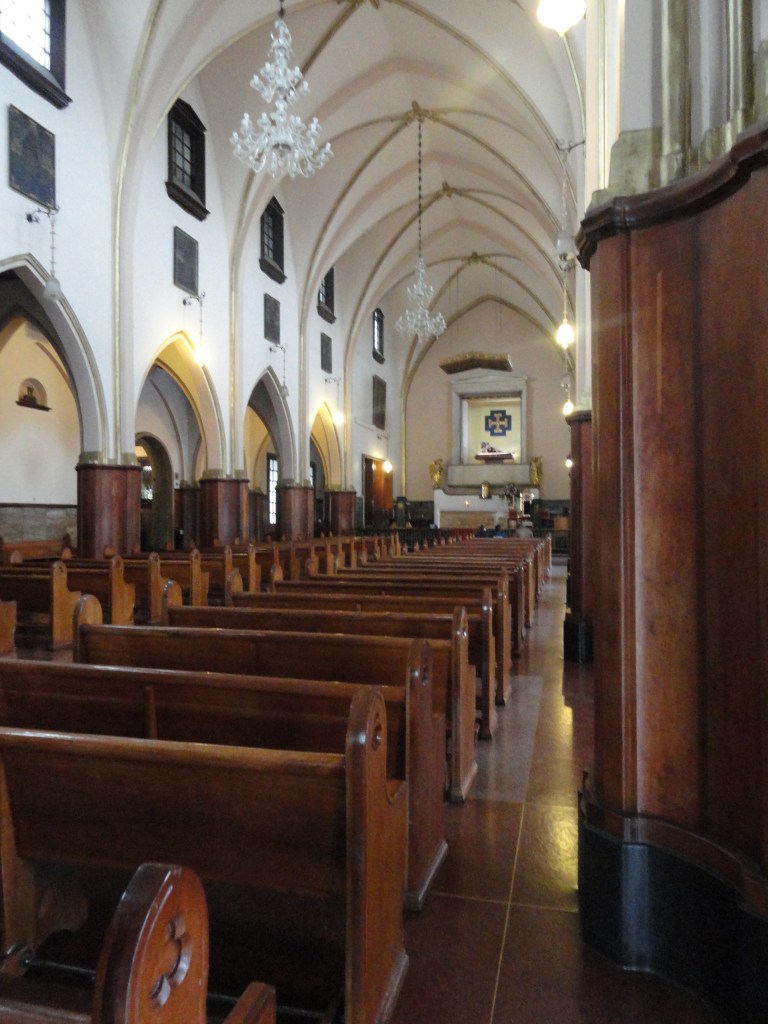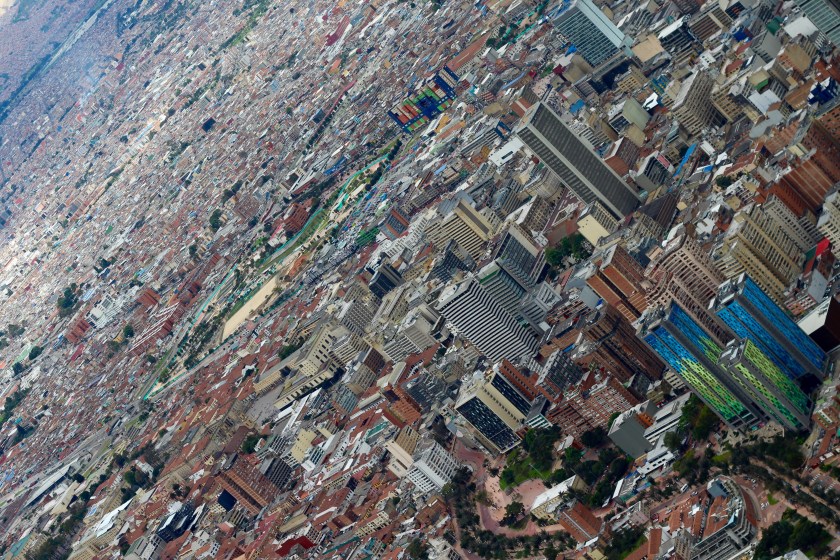 La ville elle-même est une ode aux contrastes, ayant avalée une expansion urbaine sans la comprendre. Bâtie sur un plateau a plus de 2’600m d’altitude, Bogotá est entourée de montagnes verdoyantes ponctuées parfois de maisons colorées annonçant la pauvreté d’un quartier perché. Du Cerro de Monserratt (3’152m), ou loge un monastère et un ermitage (1650) dédiée a Santa Maria de la Cruz de Monserratt, il est saisissant de voir sous ses yeux s’étendre une urbanité aussi étourdissante. Récompense d’une ascension a pic de 40 minutes de marche, ce point de vue offre une vue intégrale de la ville et de la diversité de ses quartiers : au nord se trouvent les quartiers riches et sécuritaires; au sud les quartiers plus pauvres et au pied du Monserratt, la Candelaria, le quartier historique qui se noie dans les quartiers qui le prolongent.
